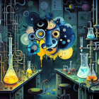 A vibrant laboratory scene showcases colorful chemical glassware, intricate pipes, and abstract designs. A surreal face emerges among the vivid hues and bubbling potions, creating a whimsical atmosphere.