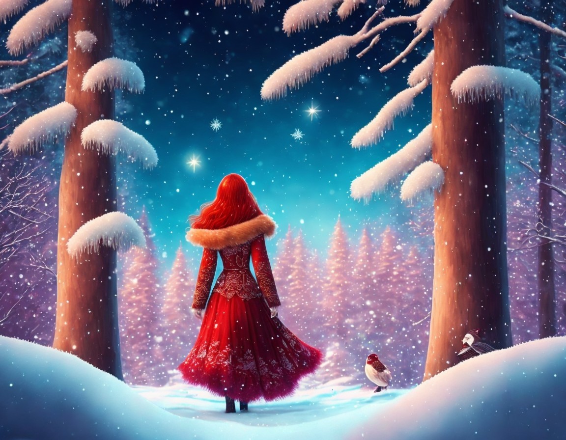 Prompt: A beautiful red haired woman is walking in an enchanted magical winter forest covered in snow. There is a blue birdhouse seen uptop a tree branch. Also seen is a snow owl flying. It is a full bright moon in the evening. There are a couple of fairies flying in this magical place. Award winning, soft delicate colors