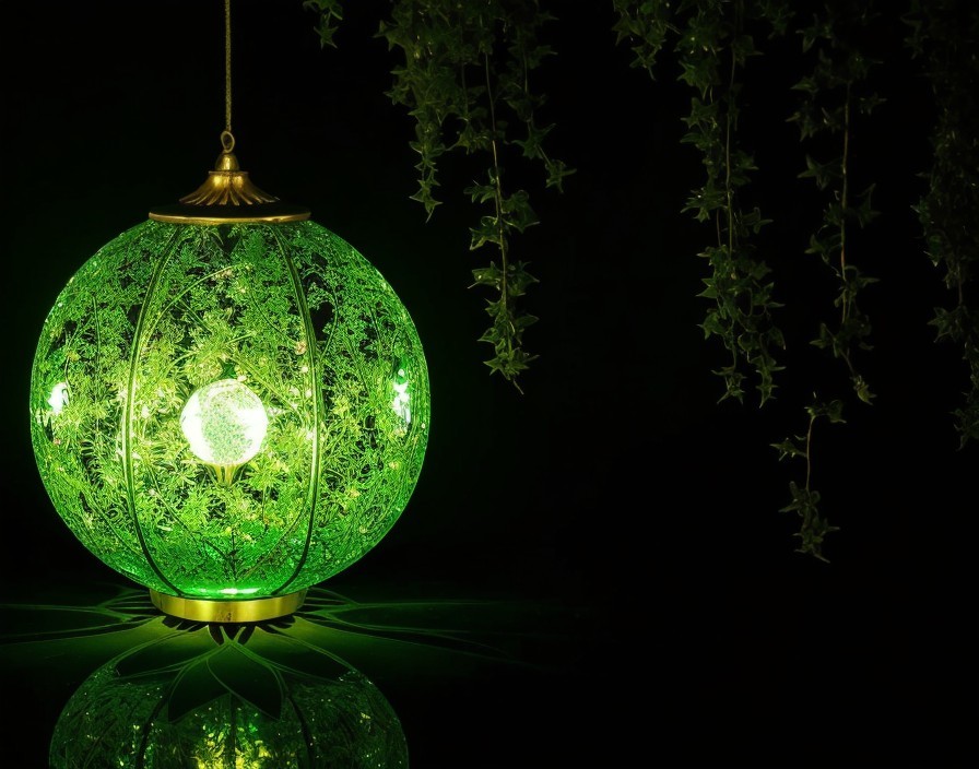 Prompt: a translucent sphere of glossy glass illuminated by a bright green light from below it. the sphere is floating. the background is a deep shade of emerald with gold filigree vines