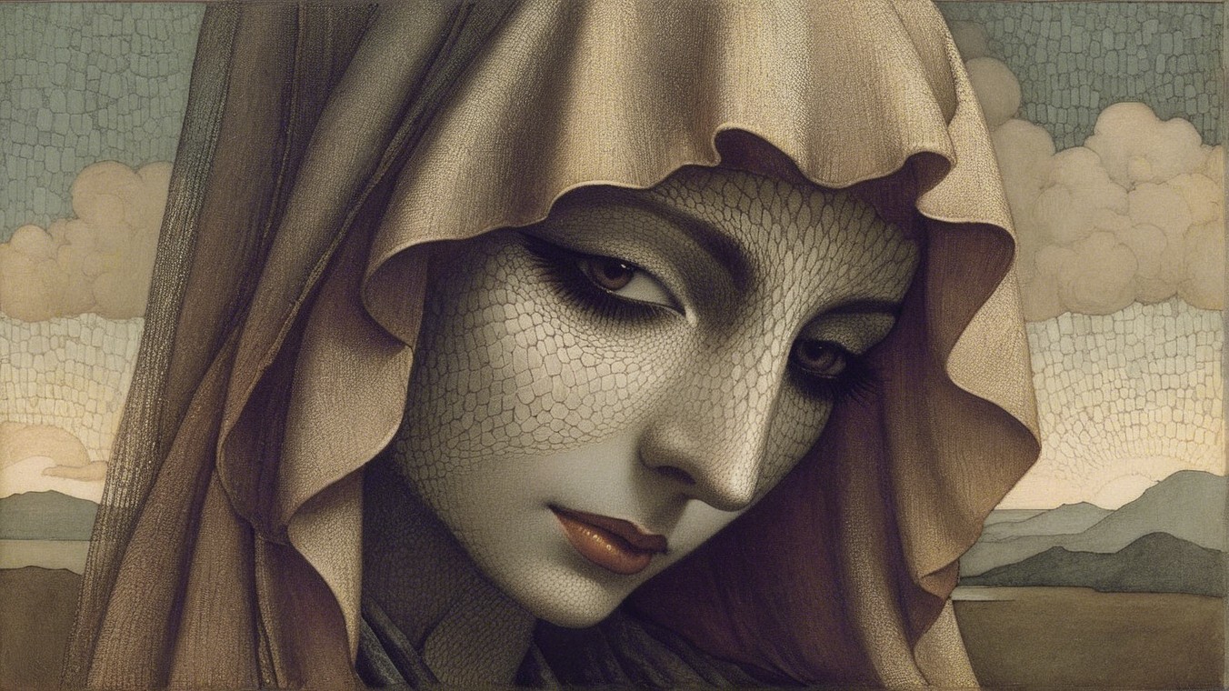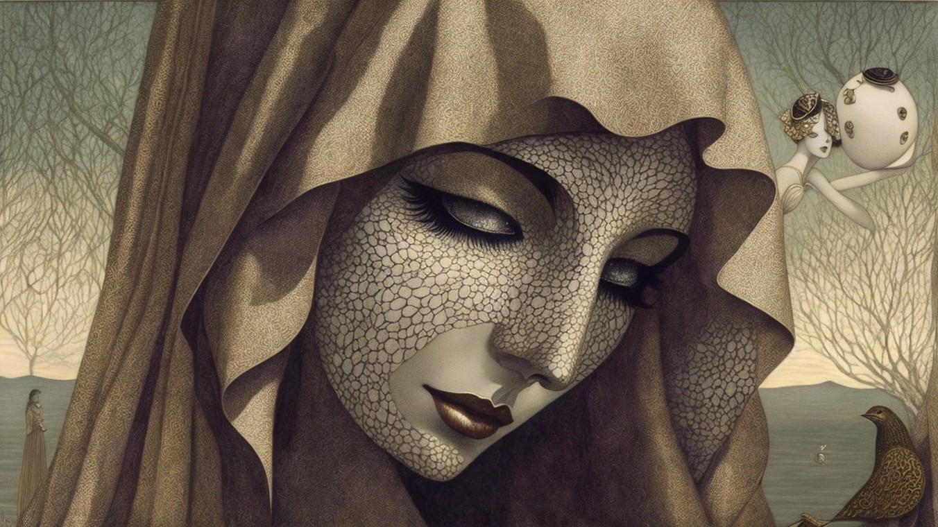 A stylish Art Deco scene features a couple dancing elegantly by the seaside, surrounded by dramatic geometric shapes and soft colors, while a mysterious figure observes in the background.