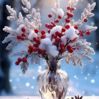 A festive winter arrangement features a vase with frosted branches, red berries, and pine cones, surrounded by a snowy landscape, evoking a serene holiday atmosphere.