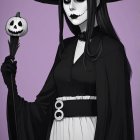 A cute cartoon girl in a black cape holds a smiling jack-o'-lantern lollipop. She has long brown hair and wears a white dress, set against a soft purple background, perfect for Halloween.