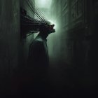 A sinister figure stands in a dim, foggy corridor, featuring disheveled hair, haunting red eyes, and a malevolent expression, evoking a chilling, supernatural presence.