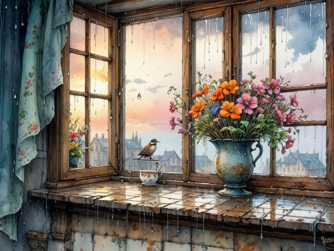 The scene shows a cozy window with raindrops streaming down the glass. Inside, a vibrant bouquet of flowers and a small bird adorn a windowsill, overlooking a picturesque, misty landscape.