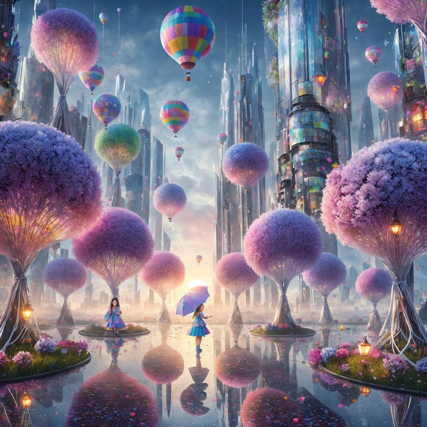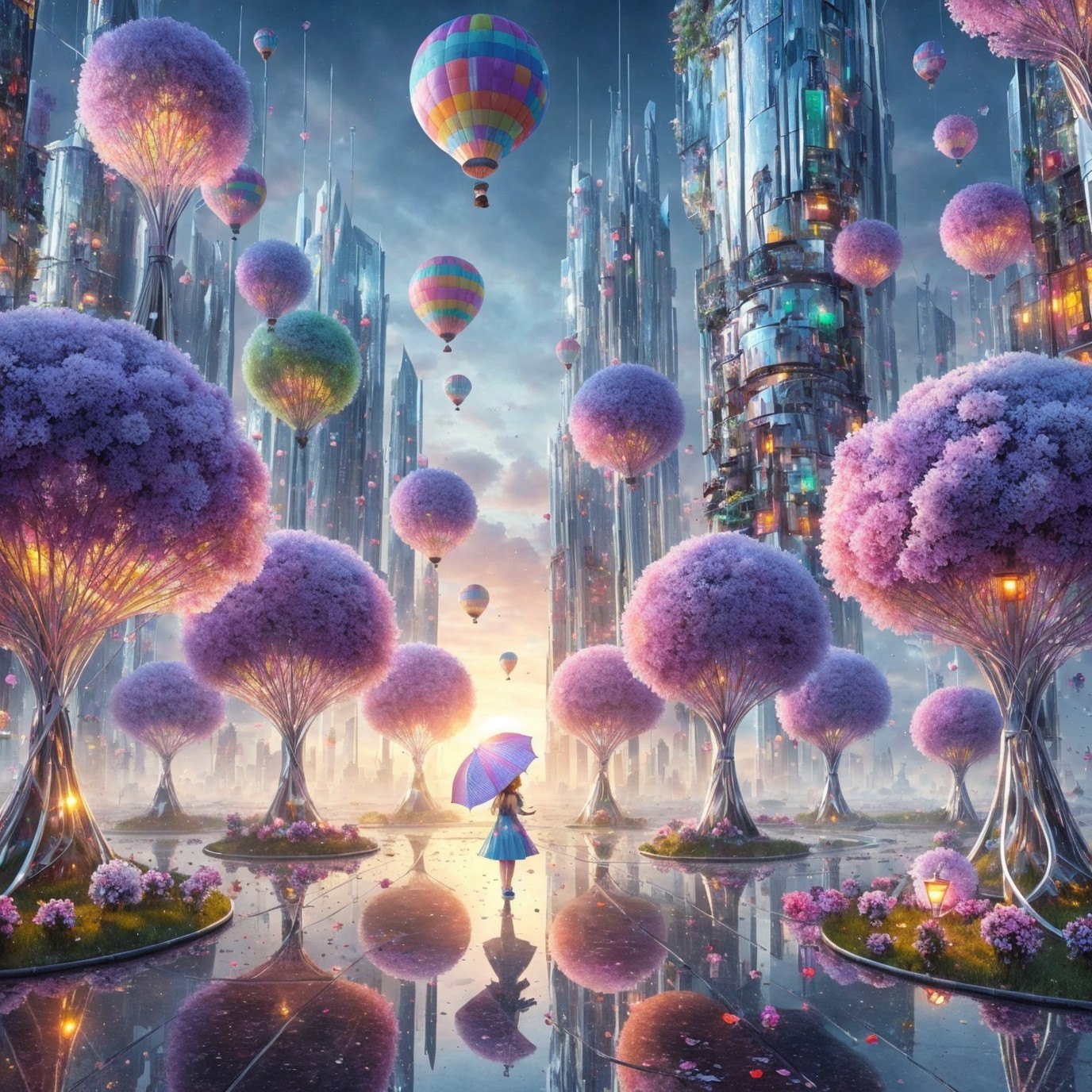 + Prompt:Ciudad futurista cubierta flores rojas , fantasía mago de Oz, globos aerostático , niña con paraguas flores lila , sueño mojado con reflejos de la lluvia