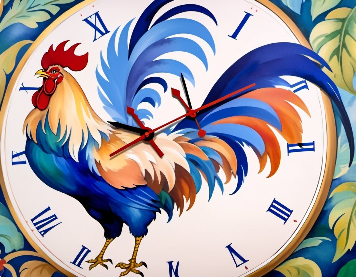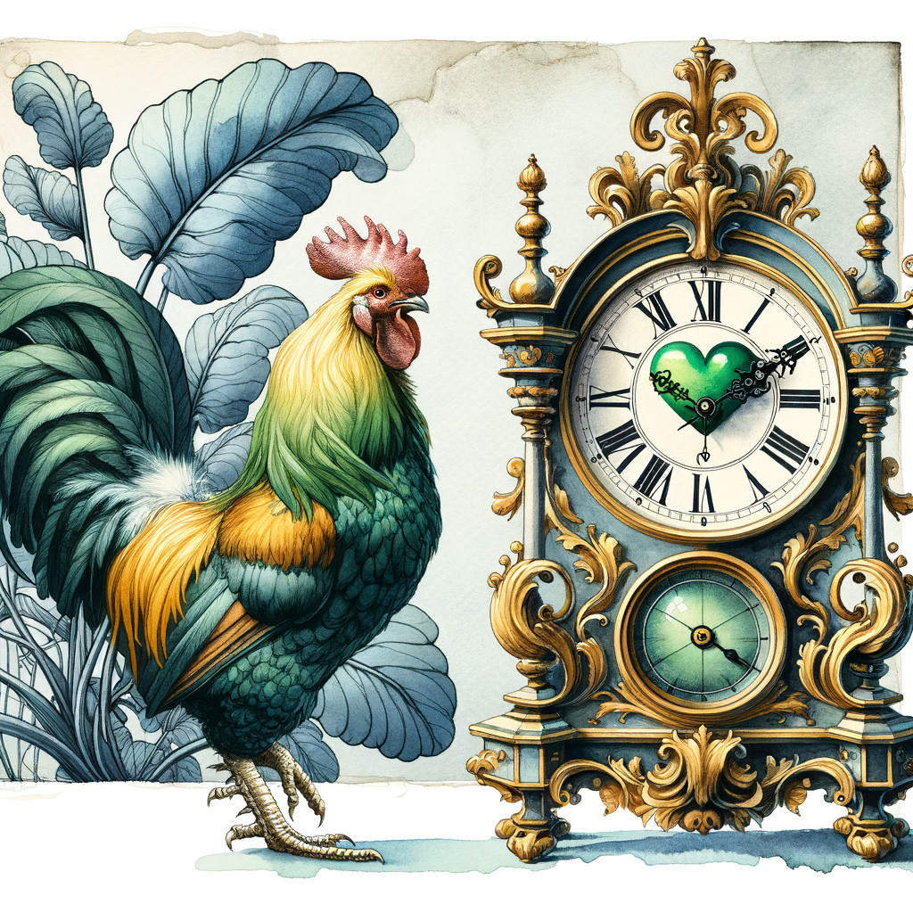 "As watercolor and ink print painting, a Matisse's style scene involving only one ancient clock and only one majestic rooster. The clock has a marquetry formwork. In the background, fields, meadows with cows, ... In the distance there is a little village with a church"