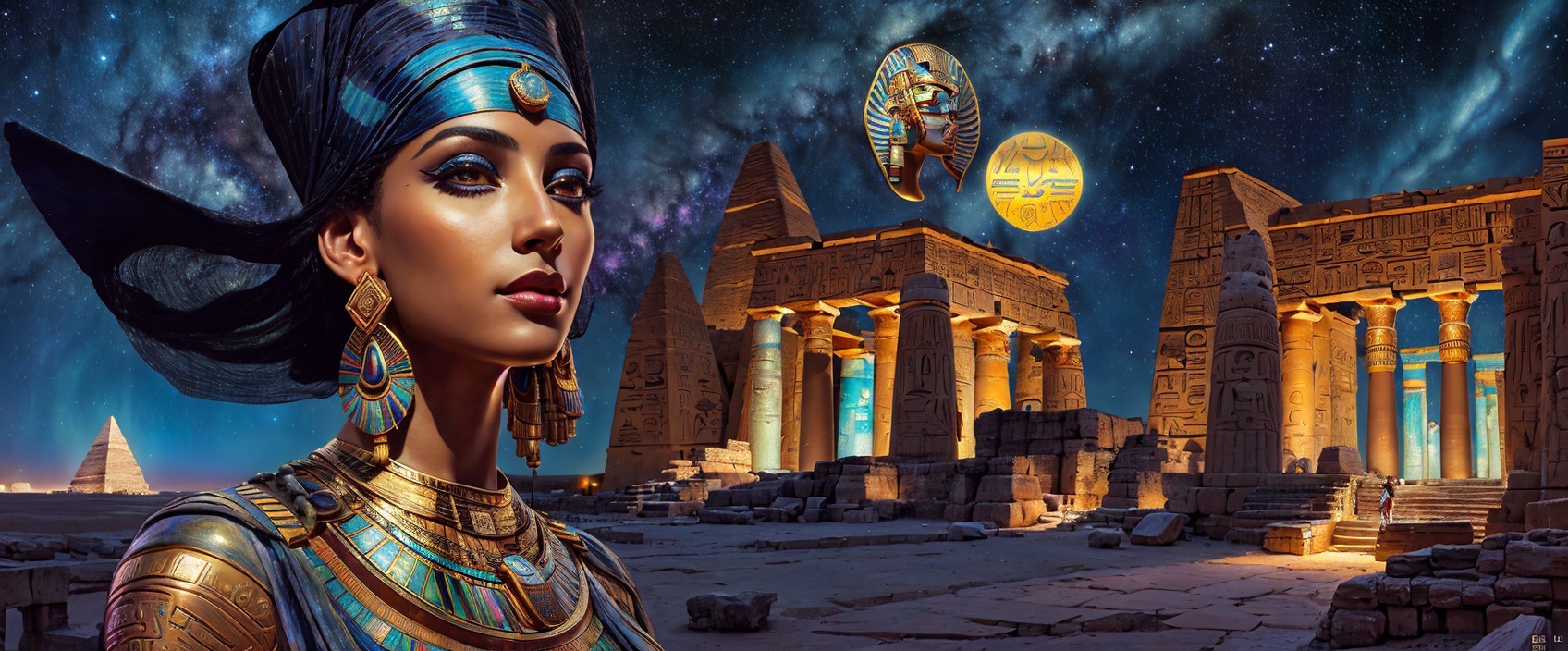 Sensual goddess of Egypt, ancient egyptian temple, Mixed media. By Enki Bilal and Gustav Klimt. Cosmic nightsky. extremely detailed ,dynamic lighting, fine art ,cosmic