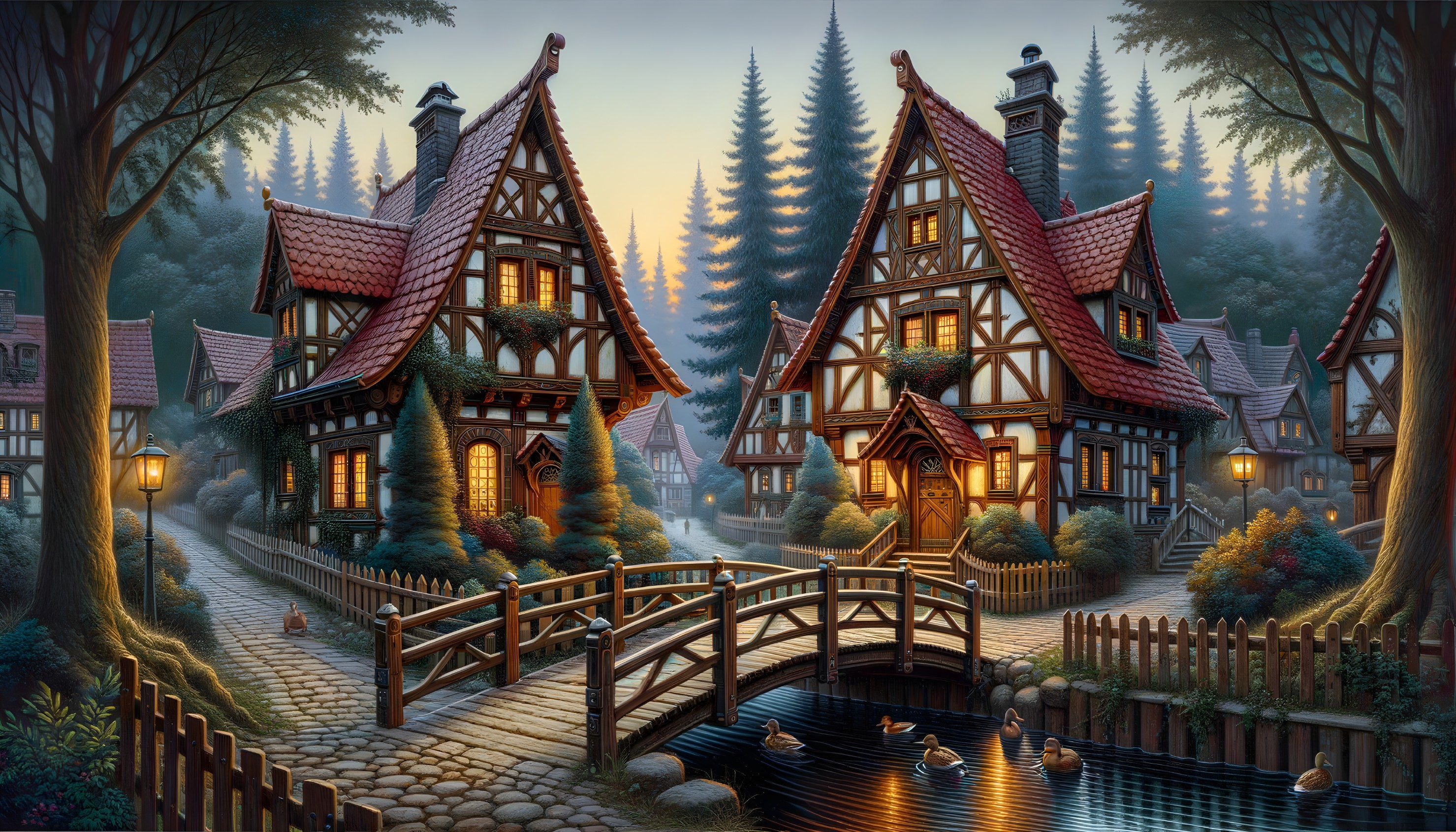 Enchanting twilight scene of a storybook village with quaint half-timbered houses, a cobblestone bridge over a gentle stream, and glowing lights.