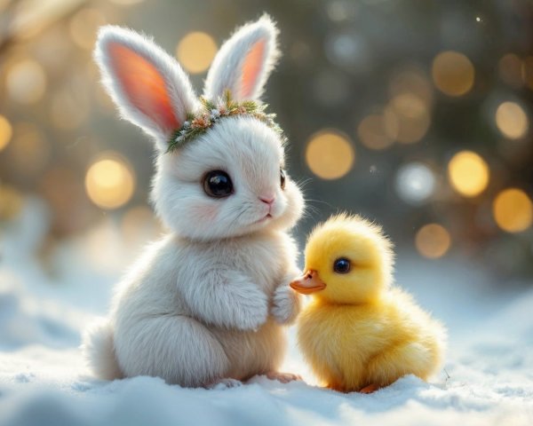 A regal black and white cat wears an ornate floral collar adorned with jewels, complemented by a delicate flower crown. A cheerful rubber duck and festive gift add charm to the scene.