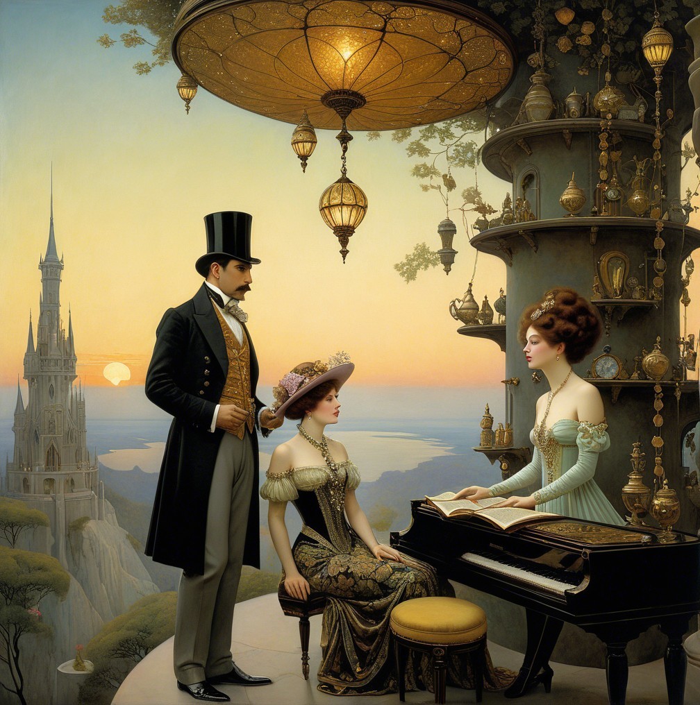 A dapper man in a top hat stands beside an ornate piano under floating hot air balloons. He holds a bowl, set against a dreamy landscape of trees and distant mountains, bathed in sunset hues.