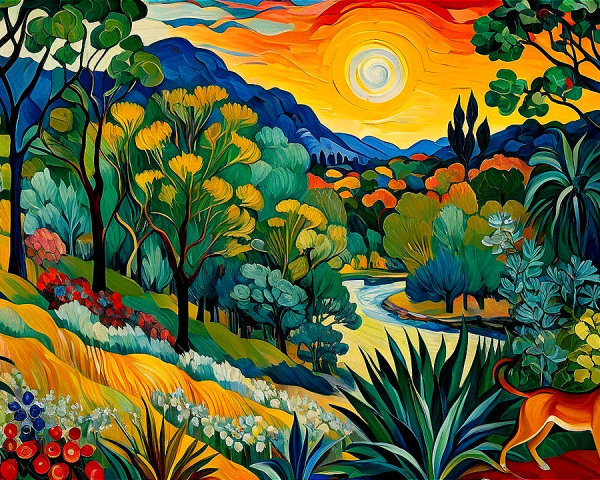 A vibrant, colorful street scene featuring charming houses in hues of orange, yellow, and green. The sky swirls with bold stars and a moon, while snow blankets the cobblestone path.