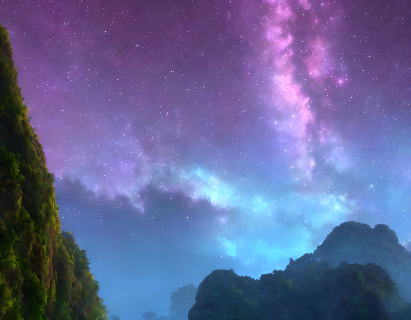 Colorful cosmic scene with glowing planet, moon, stars, and nebulae