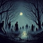 A dark, eerie forest scene illuminated by a full moon. Ghostly zombie-like silhouettes of figures rise from the misty water, surrounded by twisted trees, creating a haunting, otherworldly atmosphere...