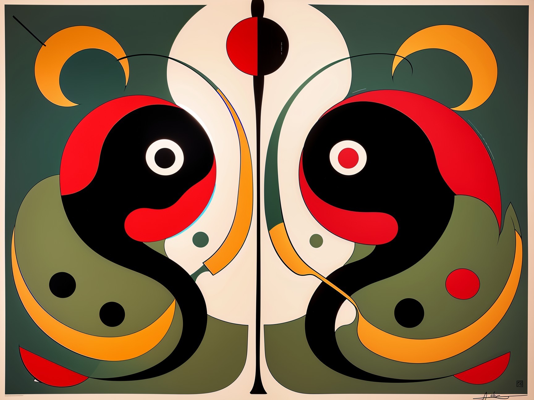 The image features two abstract figures with vibrant colors, including red, yellow, and green, mirrored around a central black pole, creating a harmonious and playful composition.