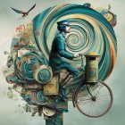 A whimsical illustration of a mailman on a vintage bicycle, surrounded by swirling patterns and ornate gears, evoking a sense of motion and nostalgia in vibrant blue and gold tones.