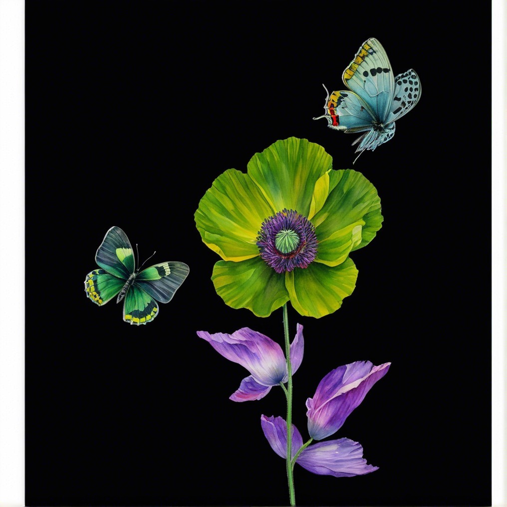 A vibrant illustration featuring colorful butterflies and a striking poppy flower against a black background, showcasing a blend of greens, purples, and reds in a lively, artistic composition.