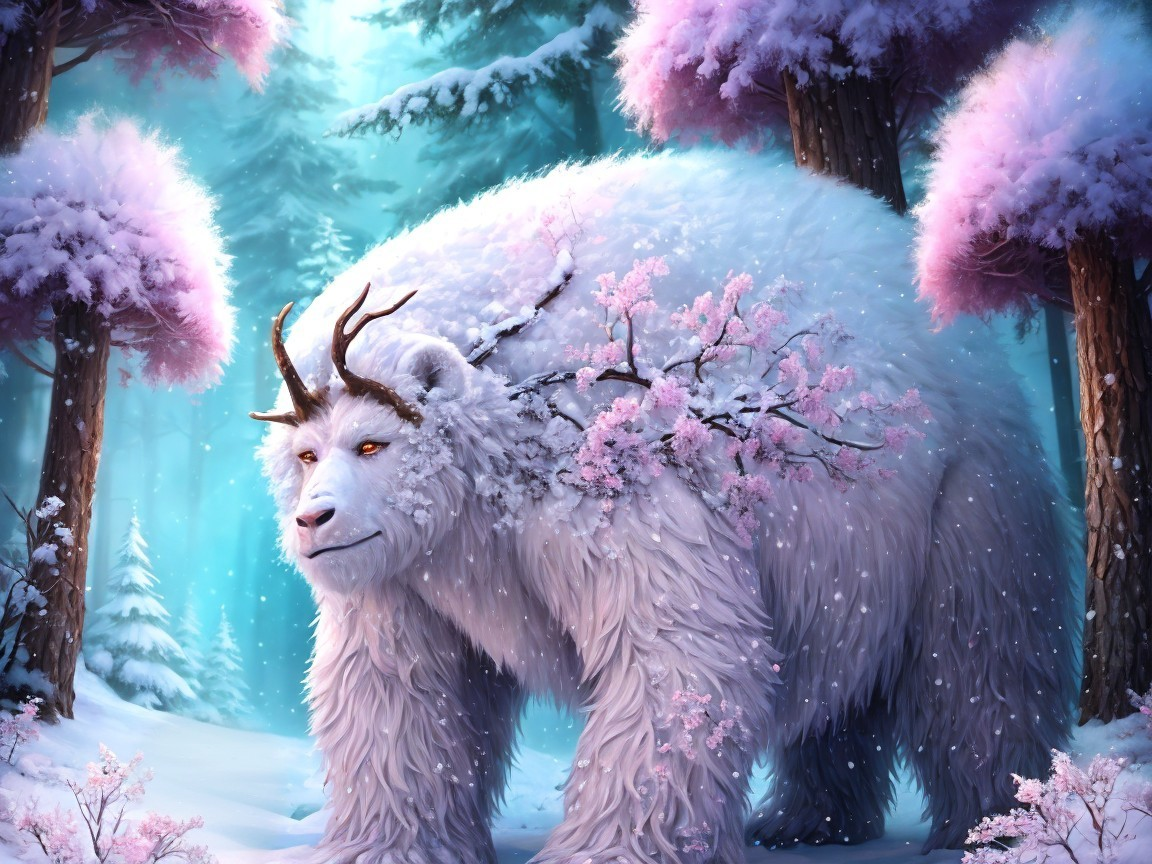 A majestic white cryptid creature adorned with a floral crown wanders through a snowy forest, surrounded by frosty trees and delicate pink blossoms in a serene, magical atmosphere.
