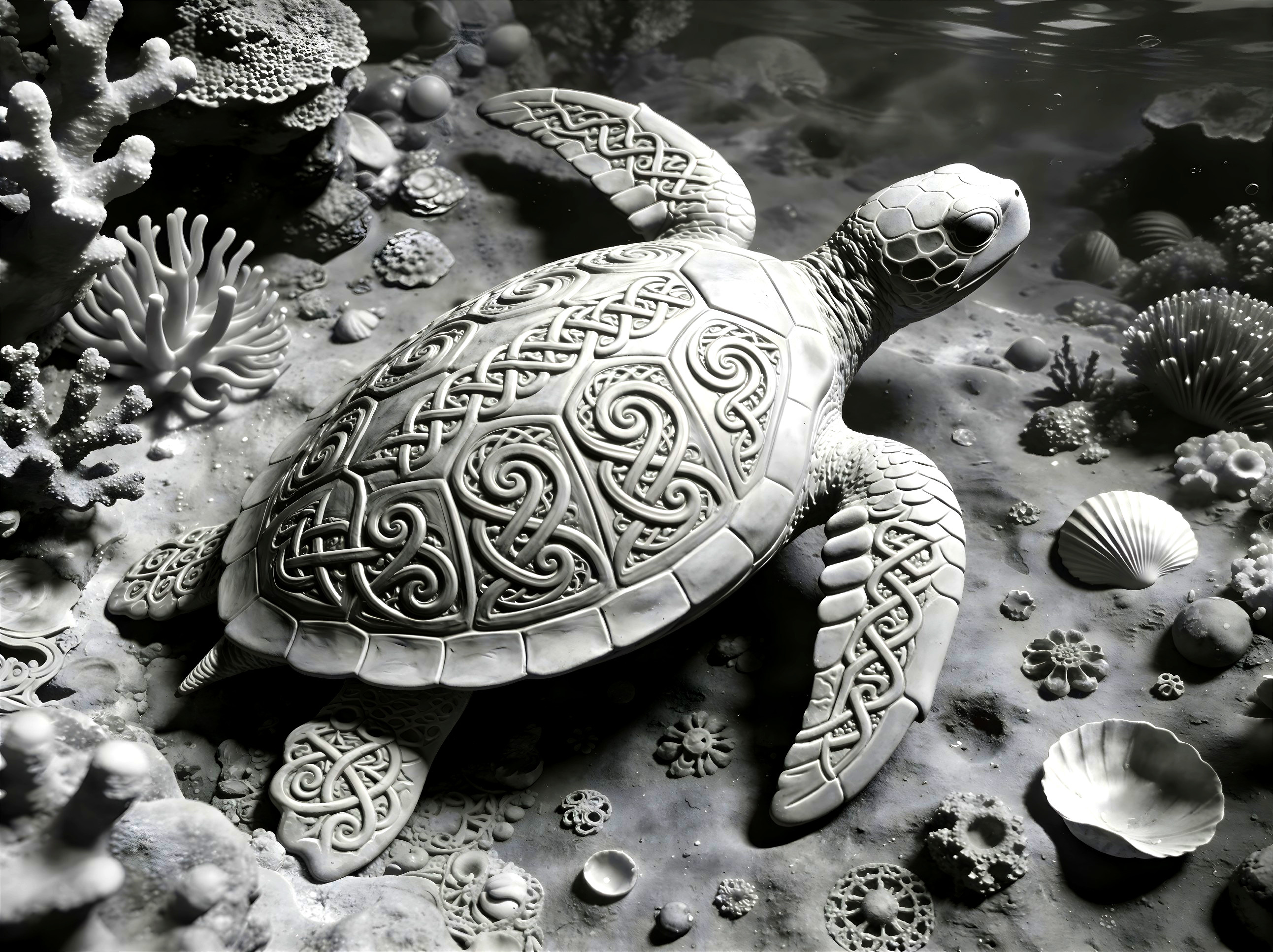 A grayscale 3D render of a sea turtle with intricate Celtic knot patterns carved into its shell and flippers, swimming underwater above a sandy seabed. The turtle is positioned in the center, facing towards the upper right of the frame, with its right flipper slightly raised. The seabed is covered