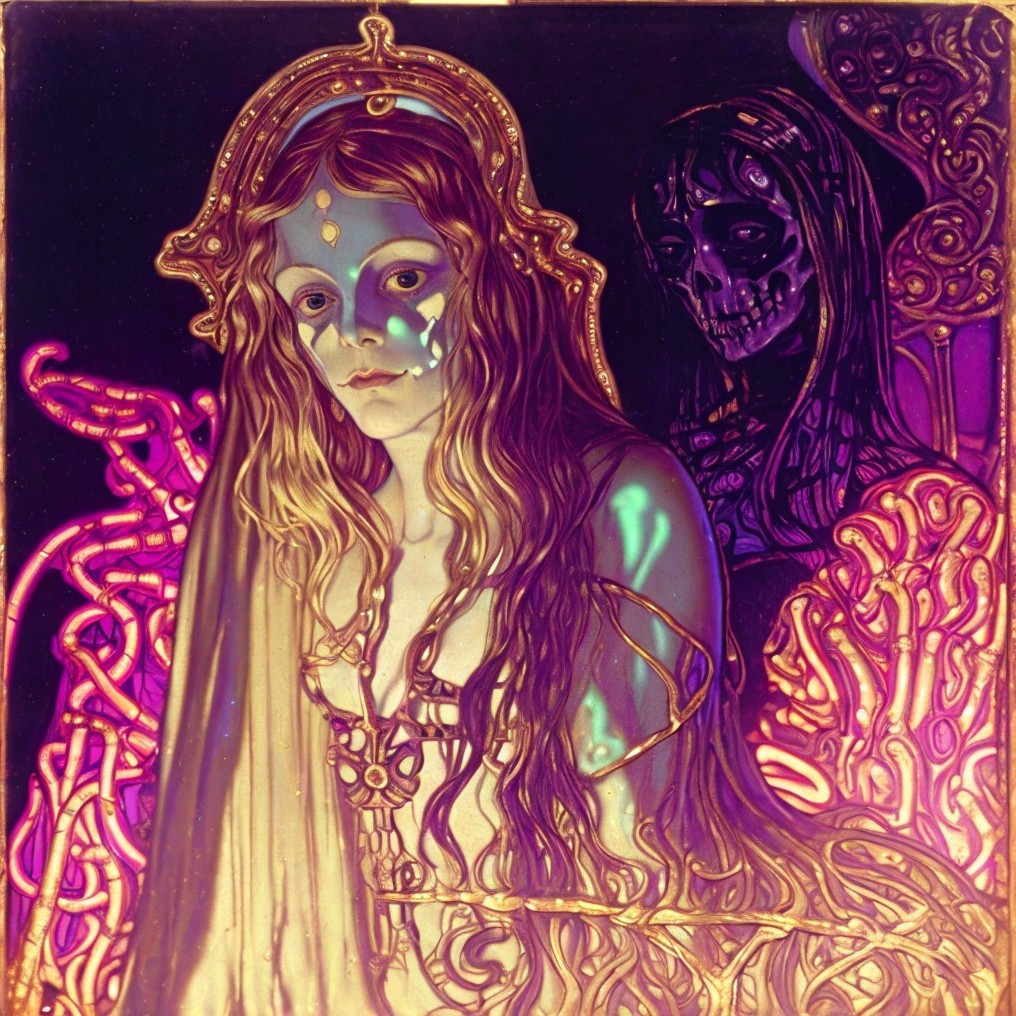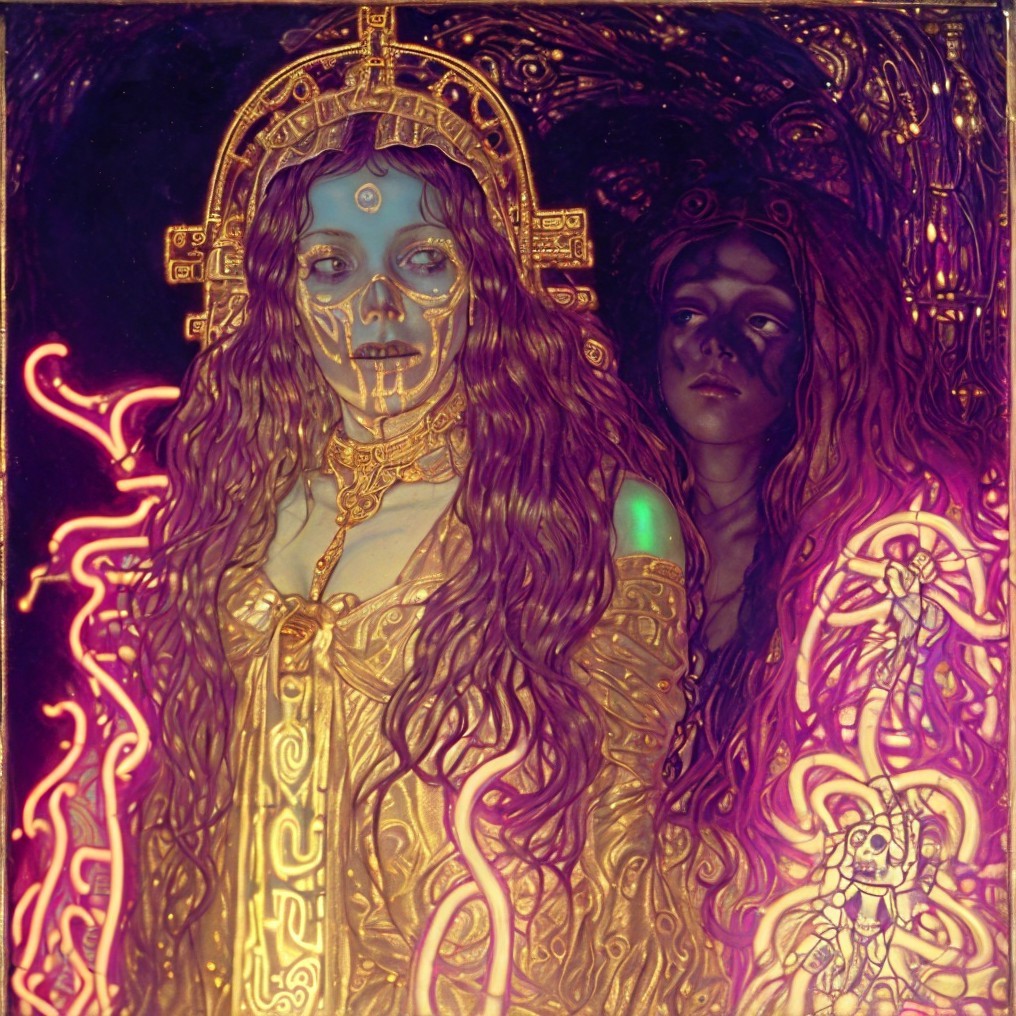 Two women with ornate headpieces and glowing eyes, surrounded by intricate golden patterns, evoke a mystical or fantasy aura.