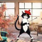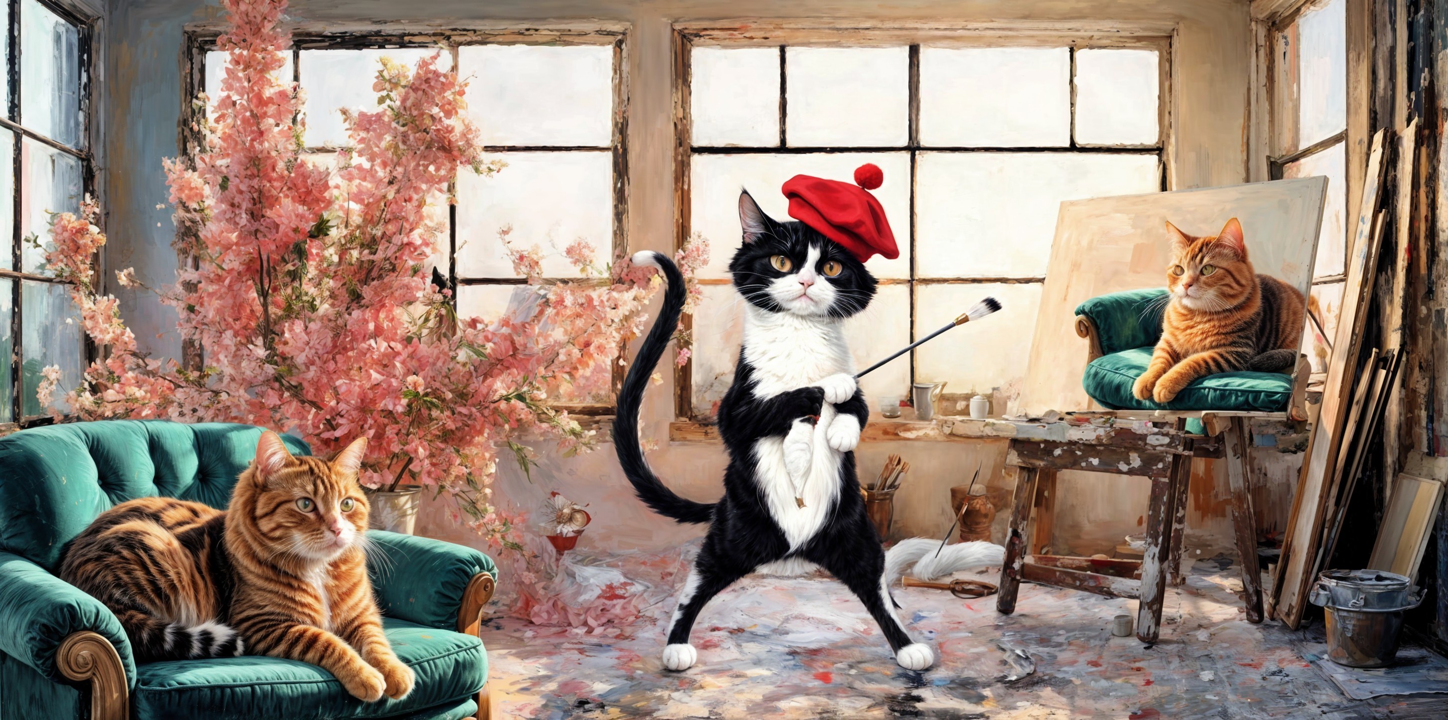 In a cozy artist's studio, a tuxedo cat wearing a red hat poses with a paintbrush, while an orange tabby lounges on a blue chair. Vibrant autumn leaves add warmth to the scene.