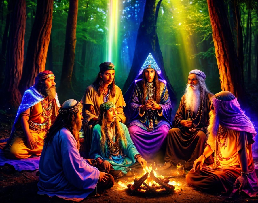 a shaman, a druid, a Muslim sage, a Christian mystic, a Hindu sadhu, all sitting around a fire, in a mystical forest setting, Hallucinations of Jungian archetypes in vivid glossy 3D format. Thoth, Alex Grey, visual art, volumetric lighting, spiritual and psychedelic, vivid intense colours, Polished, Photorealistic, unreal engine, crisp quality, light reflections, RHADS, atmospheric, 3D texture, high octane render, classic composition, ultra-realistic, sharp, clear realism, 3D shading, 3D texture, peyote feel, psychedelic, hypnogogic, very sharp, focused