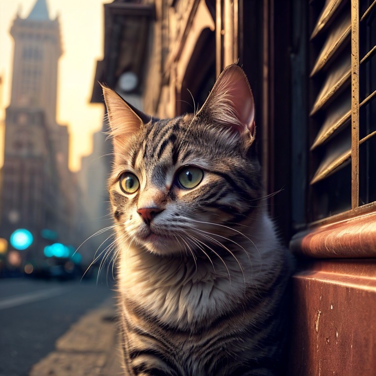 A close-up of a tabby cat with striking green eyes, thoughtfully gazing into the distance. The background features a soft-focus street scene, creating a cozy, serene atmosphere.