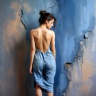 Elegant Woman in Backless Blue Outfit Against Textured Wall
