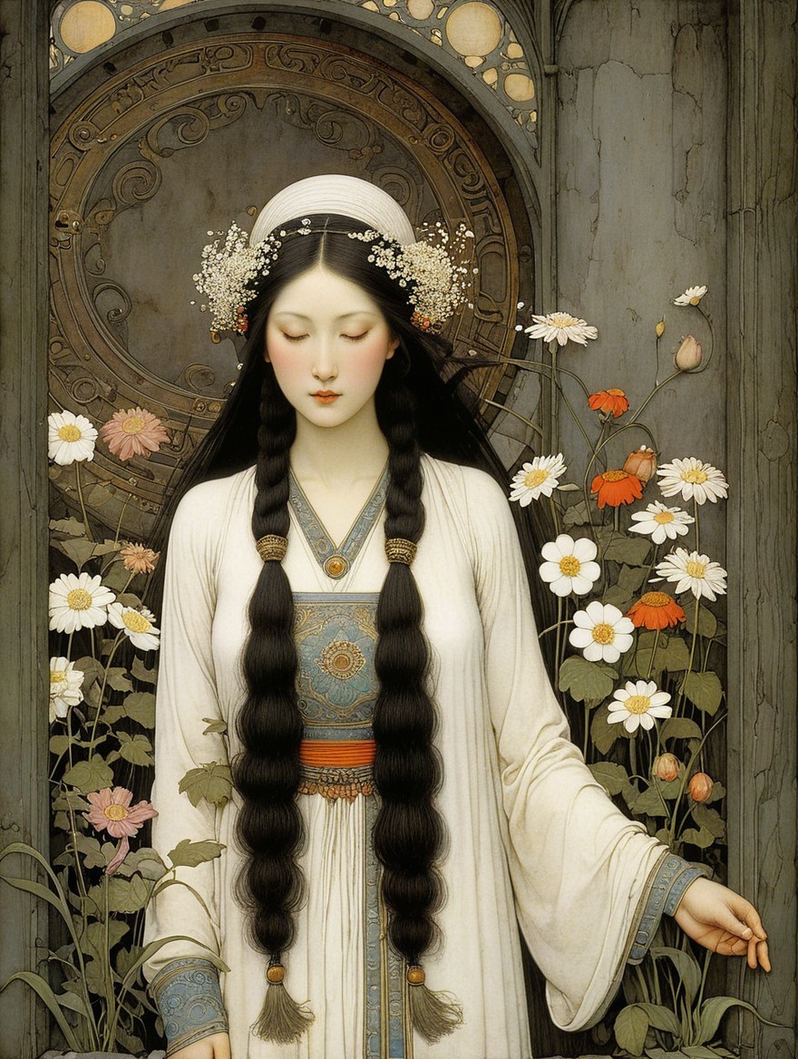 A serene figure adorned in a flowing white dress stands amidst blooming flowers and rocky scenery, her long black braids and floral crown complementing the tranquil, ethereal atmosphere.