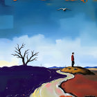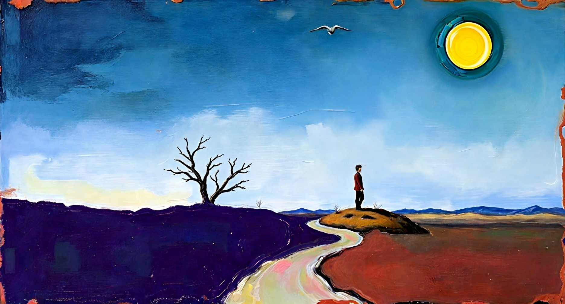 A vibrant, abstract painting depicts a landscape with a lone figure standing on a hill, a leafless tree on the left, and a river flowing through. The painting is characterized by bold brushstrokes and a rich color palette. The sky, a gradient of light to dark blue, fills the upper