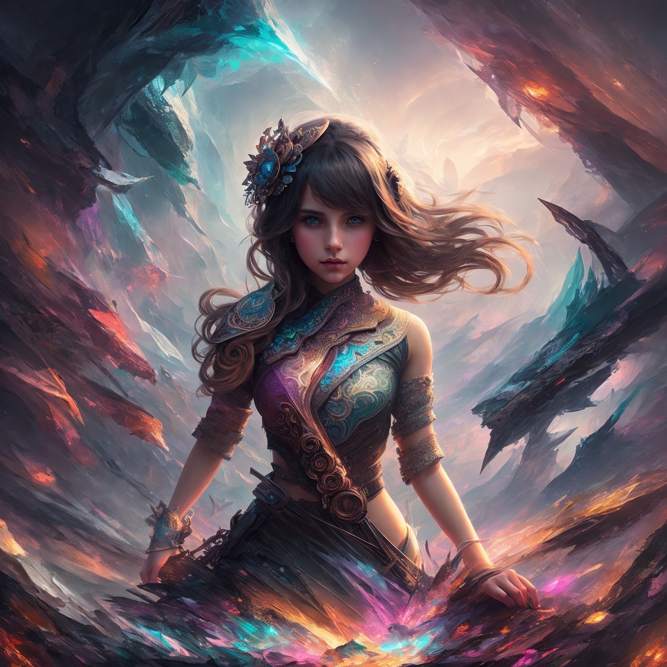 A warrior woman in ornate armor surrounded by vibrant, shard-like crystals, with a mystical castle in the background.