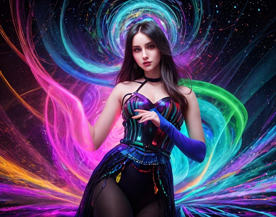 A full shot of an attractive woman in a dark fantasy outfit, including a tight black corset with vertical stripes of vibrant neon colors, a black belt with an ornate dark blue and gold belt buckle and hanging gold leaf-shaped ornaments, and a long black skirt that exposes dark pantyhose-covered legs