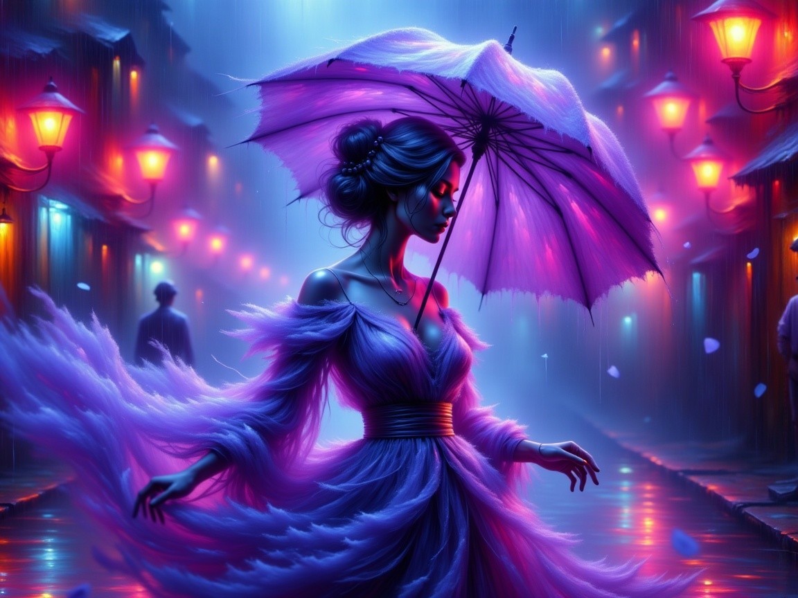 A woman in a flowing purple gown twirls under a vibrant, matching umbrella in a rainy, neon-lit street. The atmosphere is moody with reflections and soft, glowing lights.