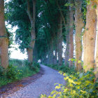 A serene forest path winds through towering trees, their lush green leaves filtering soft light. The cobblestone pathway is flanked by gentle foliage, inviting a peaceful stroll into nature's embrace.