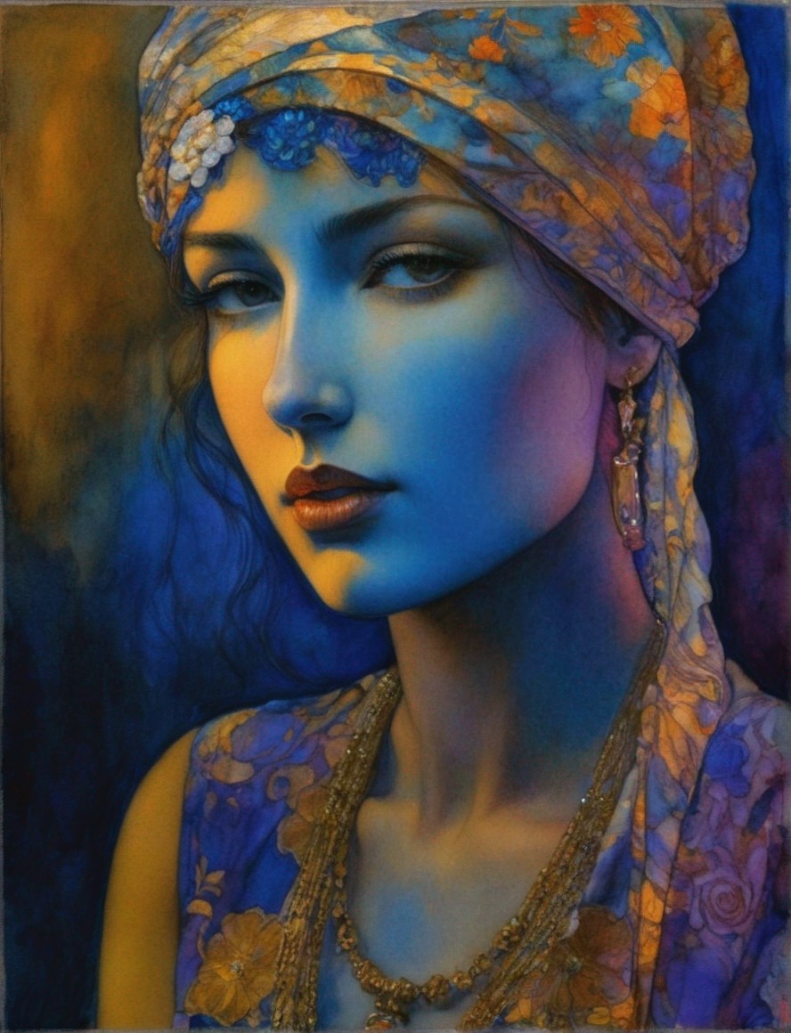A portrait of a woman with gold jewelry, a blue tint on her skin, and an elaborate headscarf against a blue background.