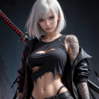 A fierce character with short, platinum blonde hair and striking tattoos stands confidently. Dressed in a torn black top and leather jacket, she wields a katana, exuding a strong, edgy presence.