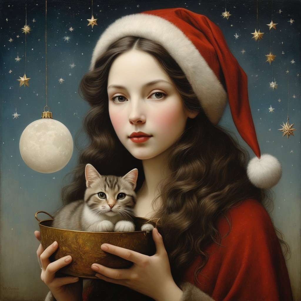 Woman in Santa Hat Holding Kitten in Golden Bowl on Starry Background