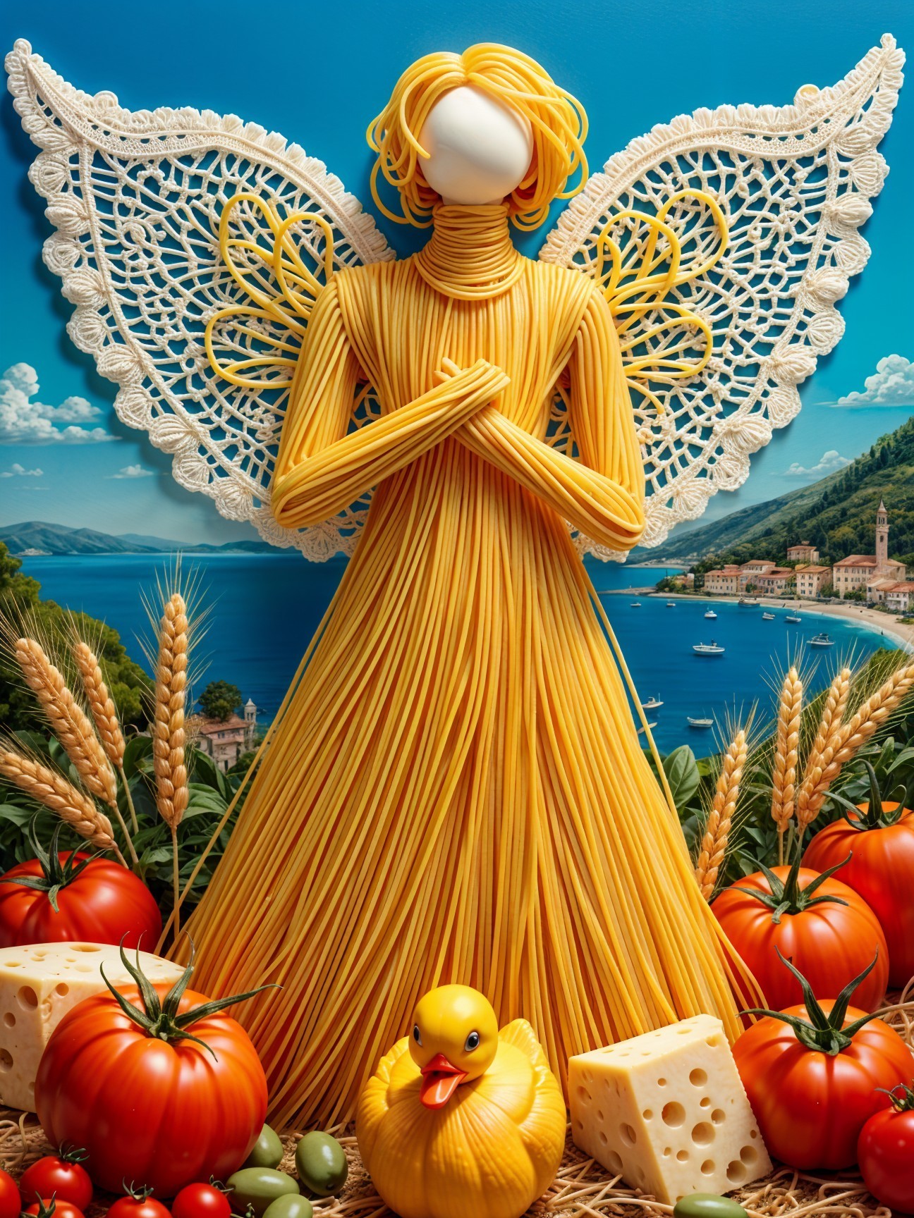 A whimsical angel figure made of pasta with yellow hair and lace-like wings stands among vibrant tomatoes, cheese, olives, and a rubber duck, set against a scenic coastal backdrop.