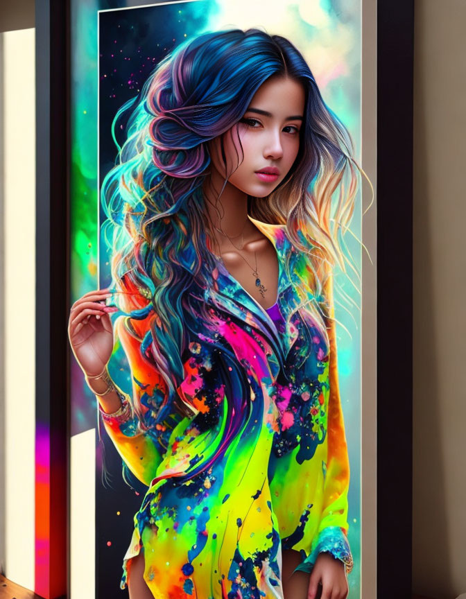 Colorful digital artwork: Woman with flowing hair in cosmic background