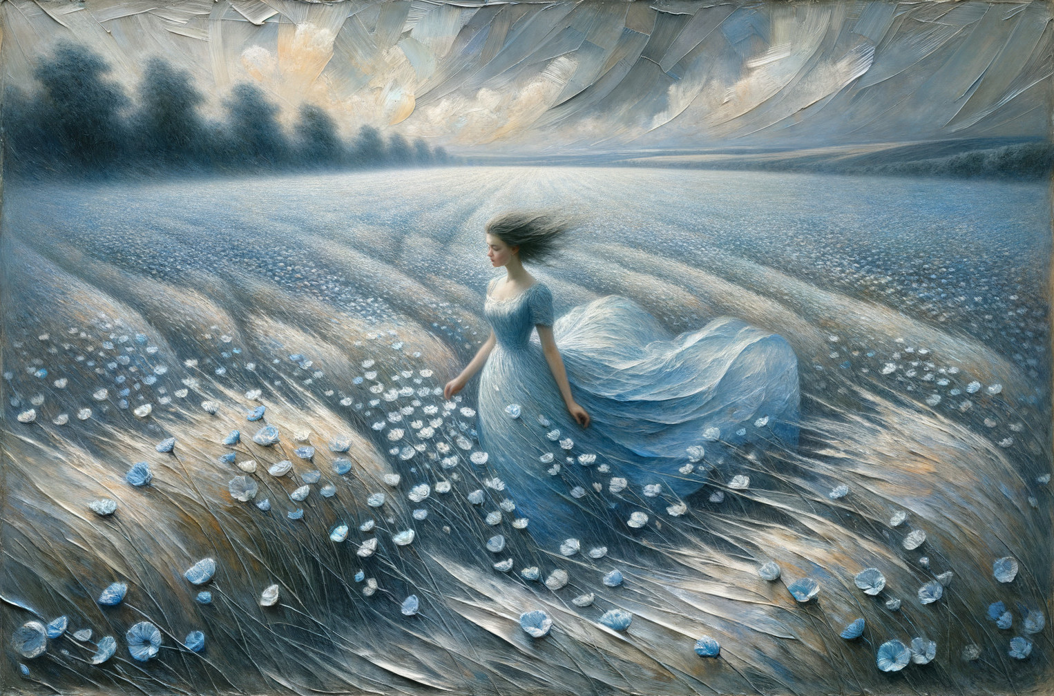 A serene landscape features a woman in a flowing blue dress walking through a field of delicate white and blue flowers. The sky is softly lit, enhancing the dreamlike quality of the scene.