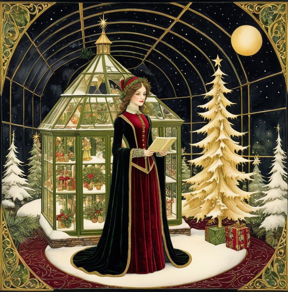Legend of the Christmas girl and the magical Christmas greenhouse at sunrise ,, 3rd century vintage Venetian miniature art. Velvet Black, Shabby, Dull Gold, olive green, burgundy, Golden Ratio, Surreal Fantasy, Elegant, High Definition Ultra Fine 3D Line, Zenangle Style, Watercolor Patchwork , Arthur Rackham Style, Paul Kidby, Gediminas Prankevicius, Jacek Jerka, Extremely Detailed, Intricate, Thoughtful, HDR, Fractal, Beautiful, Award Winning, Fantasy Look, Fantasy, Crisp Quality