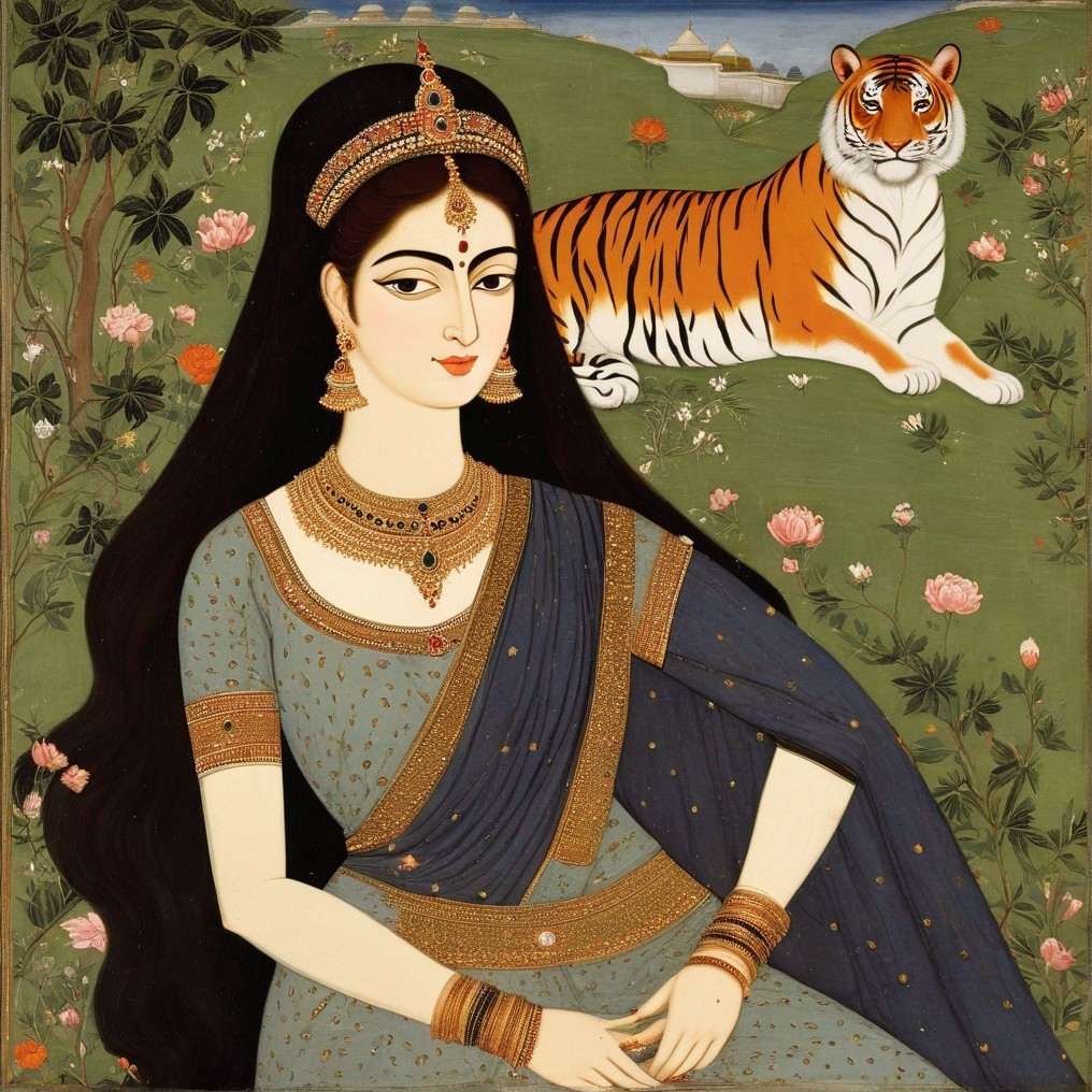 ‘A queen who came to the Mughal courts from Persia. A queen who was a great hunter. She shot several tigers. nymph. 3rd century Persian miniature art, umber, sage green, pearl grey, paprika, blue-grey, Velvet Black, Shabby, Dull Gold, Amber Gray, Golden Ratio, Surreal Fantasy, Elegant, High Definition Ultra Fine 3D Line, Zenangle Style, Watercolor Patchwork , Arthur Rackham Style, Extremely Detailed, Intricate, Thoughtful, HDR, Fractal, Beautiful, Award Winning, Fantasy Look, Fantasy, Crisp Quality