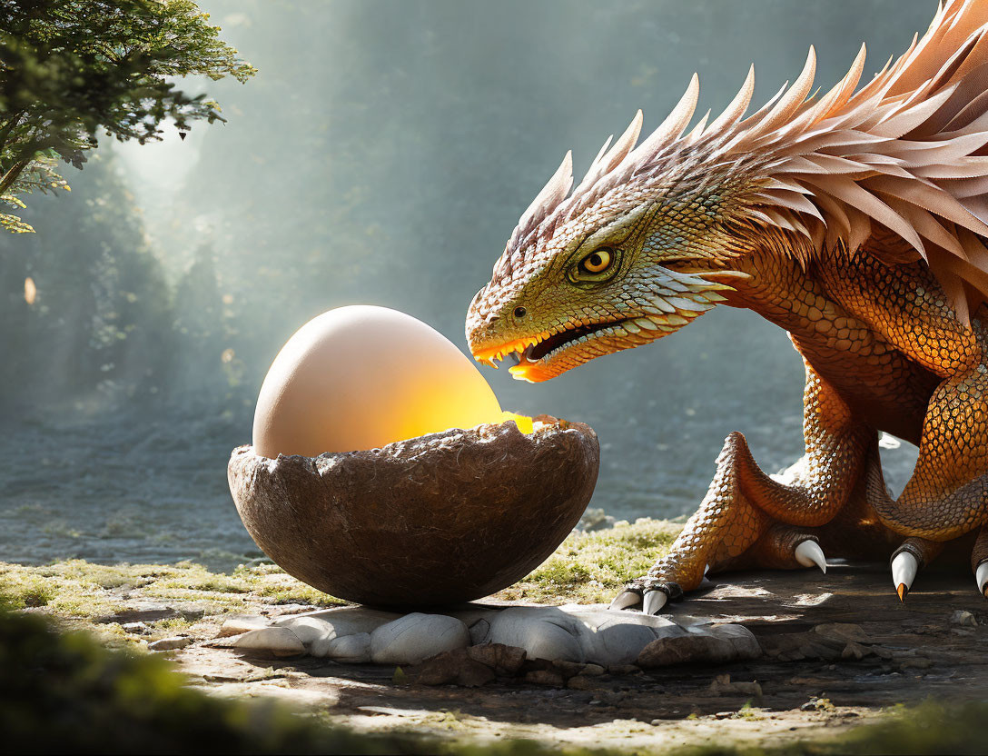 Majestic dragon with glowing egg in mystical forest setting