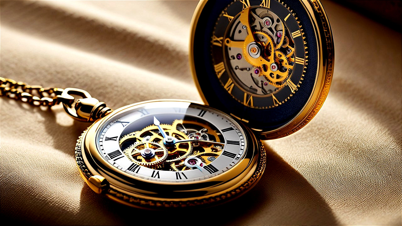 An elegant golden pocket watch with intricate mechanical gears on display. Its classic design features Roman numerals and a polished finish, resting on a soft, textured fabric.