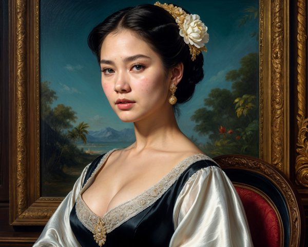 A young woman with delicate features and elegant attire gazes thoughtfully from a balcony, adorned with intricate jewelry, against a scenic backdrop of an enchanting, medieval city.