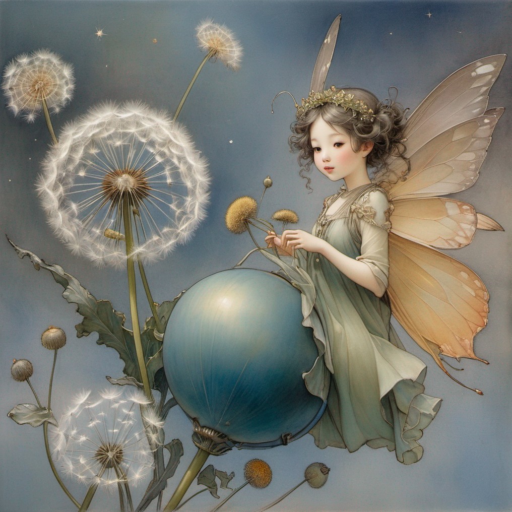 An ethereal artwork depicting a graceful fairy with translucent wings holding a dandelion amongst floating seeds against a serene blue backdrop.