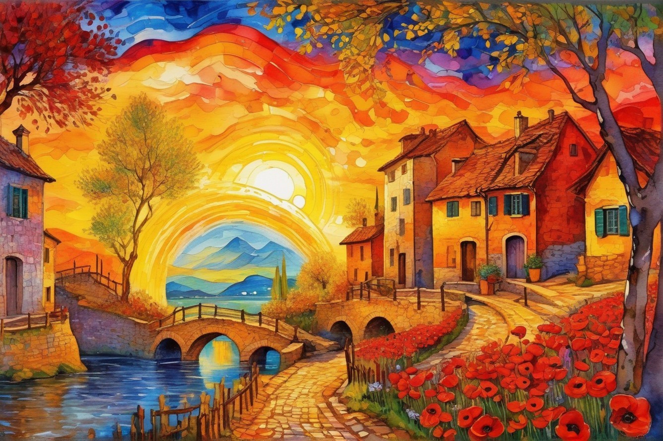 A vibrant, colourful painting of a quaint village with houses by a river at sunset, featuring a rainbow, red poppies, and autumn trees.