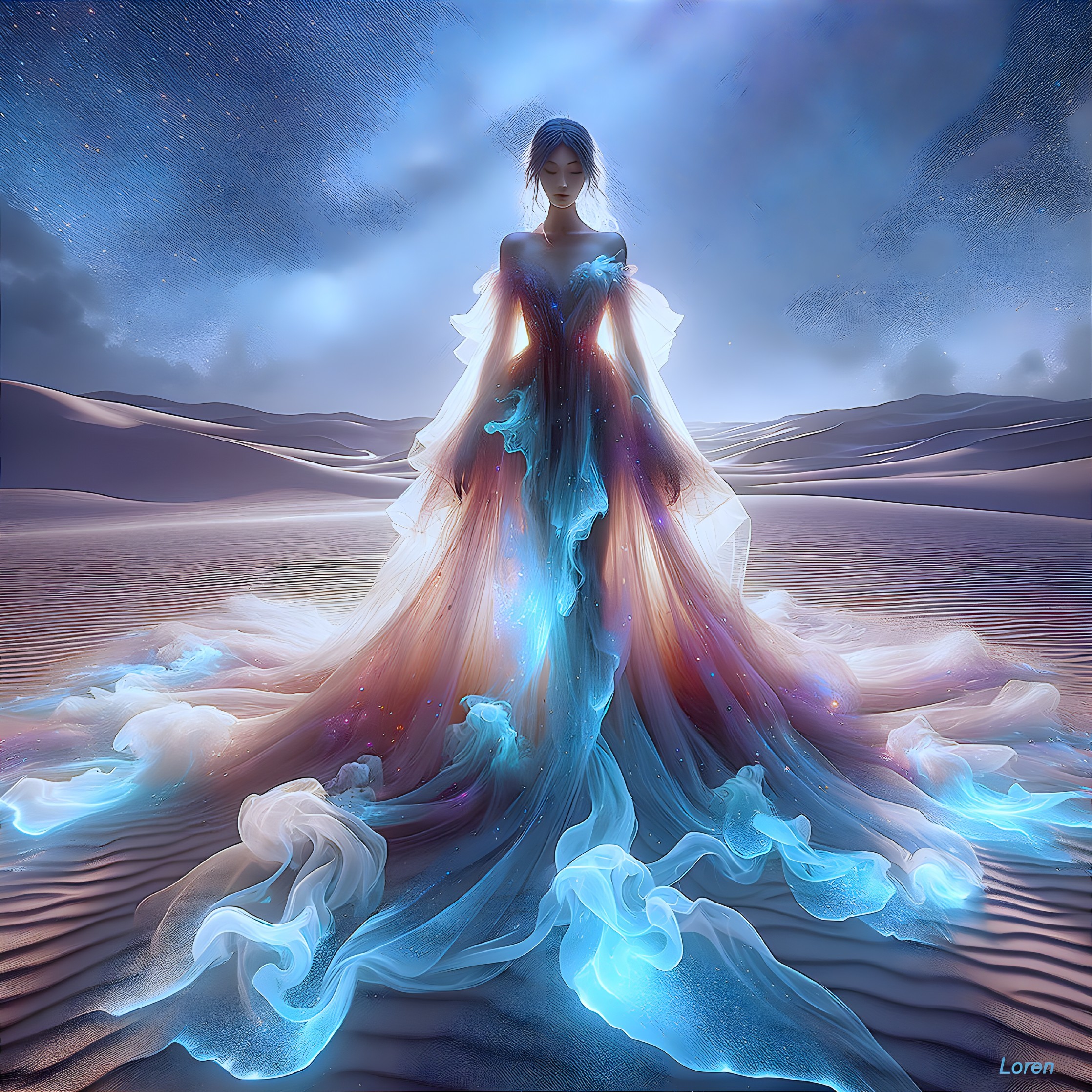 A woman in a flowing dress stands in a desert under a starry sky; her gown merges with the cosmos, evoking a surreal, ethereal scene.