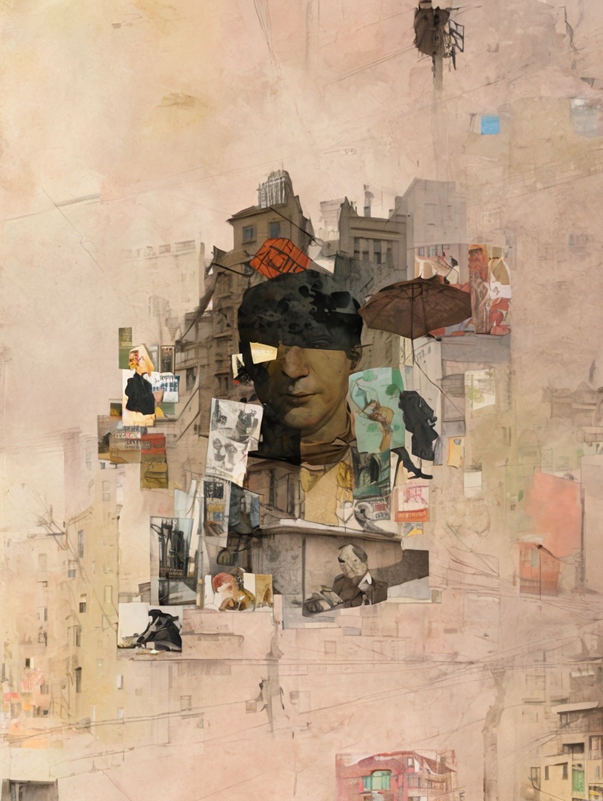 Watercolor-style cityscape illustration with haphazard buildings & earthy tones