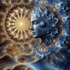 A stunning digital artwork featuring a blue-hued female face in profile, adorned with intricate fractal patterns and spirals. The background glows with swirling golden and blue tones, creating a mystical aura.