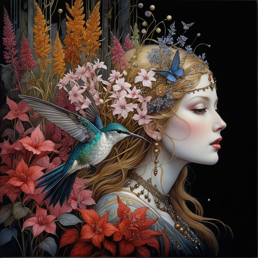 A serene woman adorned with vibrant flowers and hummingbirds, her flowing hair intertwined with nature. The artwork beautifully blends elegance and the lively spirit of wildlife.